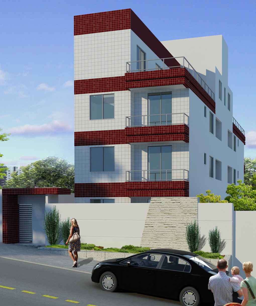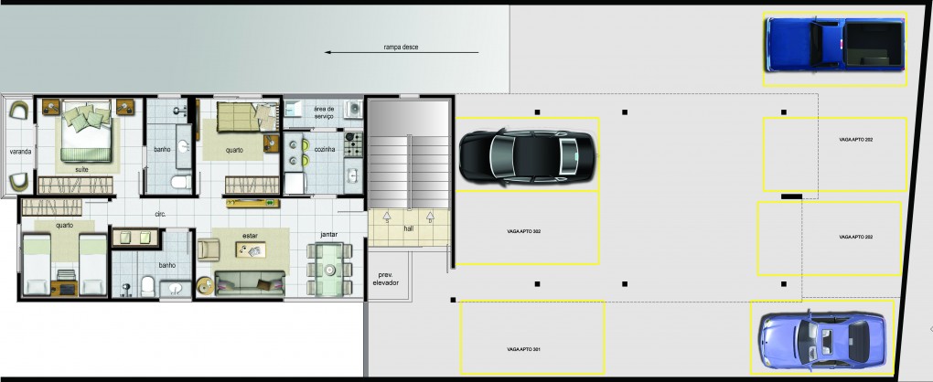 Prédio com 4 andares, 7 apartamentos com 2 vagas cada.
